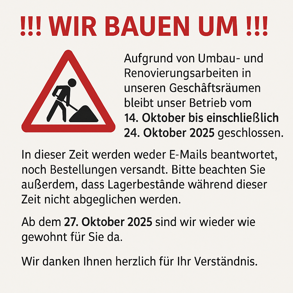Aufgrund von Umbau- und Renovierungsarbeiten in unseren Geschäftsräumen bleibt unser Betrieb